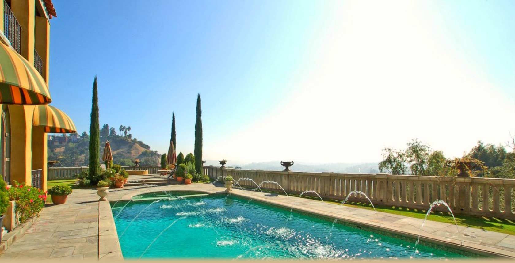 View of downtown Los Angeles from inside the pool house.The private entrance through a 500 sq. ft. covered grotto seating area is made with ancient reclaimed terra cotta tiles. Poolside dining table. Exclusive use of entire lawn and garden, pool, hot tub and additional 500 sq. ft. of outdoor patios. Enjoy 5000 total square feet of al fresco living area.